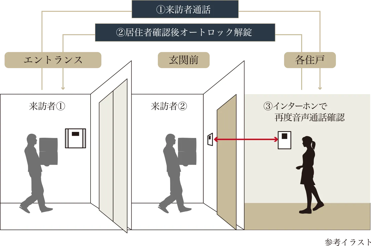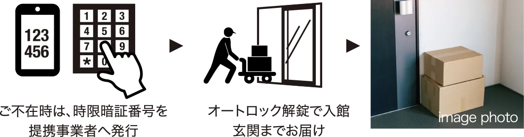 一定のセキュリティを確保したまま、配達員などの特定事業者がネットスーパーの注文品や、毎日の新聞を玄関前まで届けてくれるサービス。緊急時の作業員入館もセキュアな環境で行え、セキュリティも万全です。留守中でも、安全に荷物を届けてもらうことができ、朝、1Fまで新聞を取りに行く手間が省けたり、重い荷物を玄関前まで届けてもらえたりします。