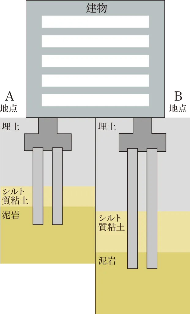 事前の地盤調査を行なった上で、支持地盤まで既成コンクリート杭を打設し、マンションの基礎部分を直接のせています。