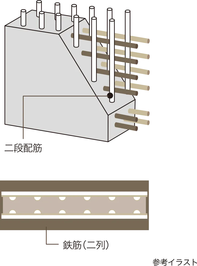猛烈な風が吹く台風や、地震など、建物にかかる水平力の影響を受けやすい戸境壁には、壁内部の鉄筋を二重に組み上げる「ダブル配筋」のRC壁を採用しています。