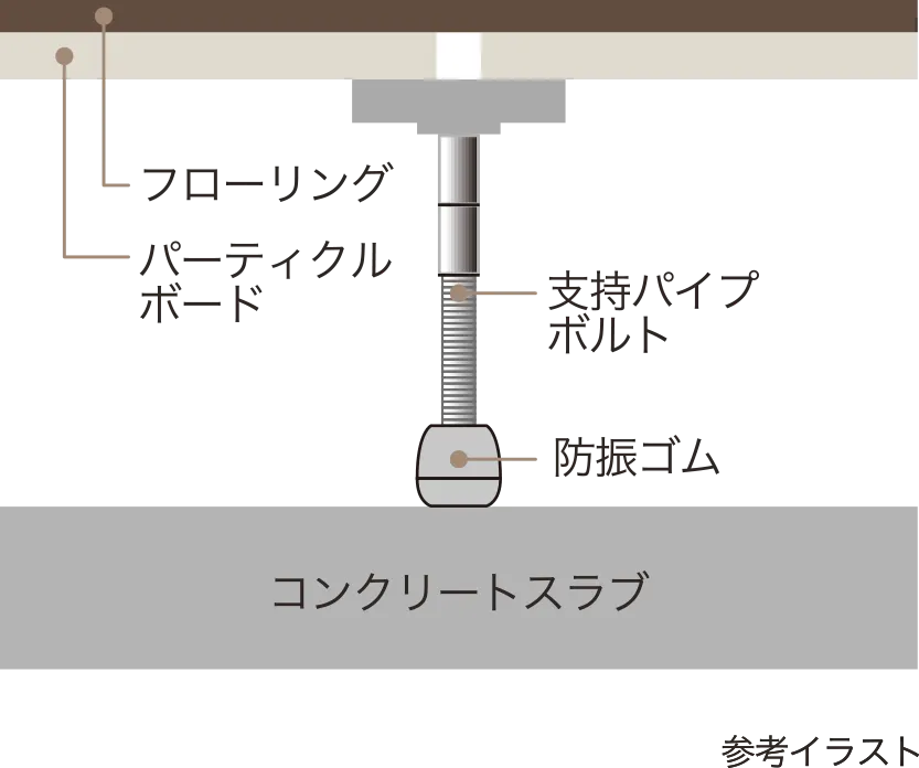 床材とコンクリートスラブの間は防振ゴムを支持脚にして空気層を確保した二重床構造を採用。上階と下階の生活音が伝わりにくいよう遮音対策を施しています。