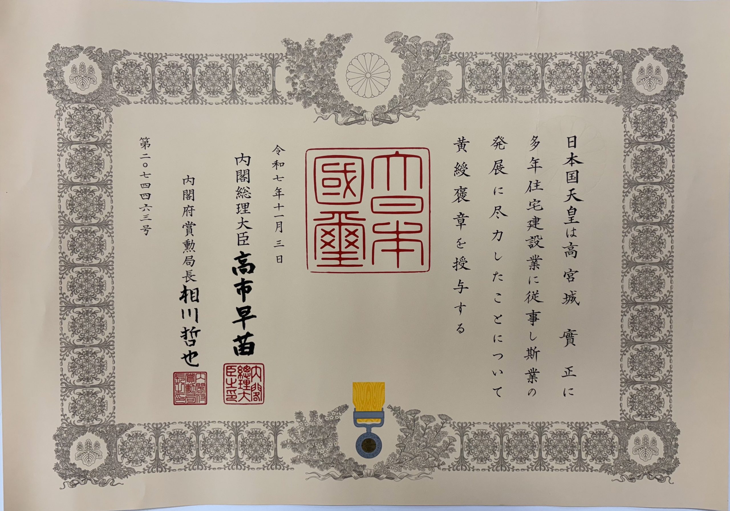 2025年秋の褒章において黄綬褒章(住宅建設業)を受章いたしました。
